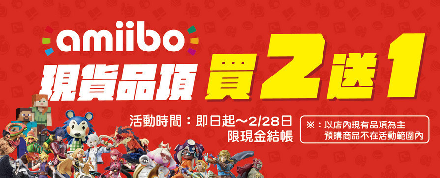 1. 茶米電玩品牌商城2026新年快樂活動期間特選 amiibo現貨品項 買二送一(品項不得重複),不囉嗦特選 amiibo現貨品項任選三款(結帳付二款價錢)就送挑選三款其中最低價錢的一款(免費),買四送二以此類推,amiibo品項款式不得重複,組合類算一款(以系統下單限制為主)。